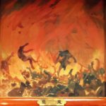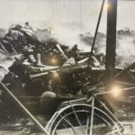 関東大震災の発生は1923年午前11時58分、それを示す焼け残った時計が残されていました(写真上)。地震発生から約4時間後の16時前後に、被服廠跡地で火災旋風が発生します。被服廠跡地には当時、4万人ほどの被災された方々が避難していましたが、火災旋風の発生で3万8千人もの尊い命が一瞬で奪われました。関東大震災での死者・行方不明者は10万5千人前後ですから、そのうちの三分一に当たります。火災旋風を示す写真や映像はありませんが、当時の様子を記した絵がありましたのでご紹介します。(写真右)また沈火後の写真もご紹介しますが、改めて火災の恐ろしさを痛感するような写真です。(写真下)