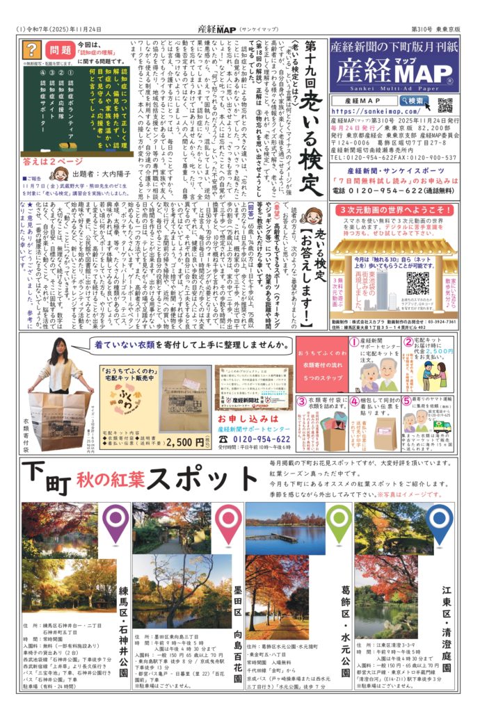 一面では恒例の「老いる検定」第十九回を掲載。認知症との向き合い方を分かりやすく解説し、地域から寄せられた質問にも丁寧に回答しています。下町お花見スポット特集では、清澄庭園・向島百花園・石神井公園・水元公園を紹介。紅葉の見頃やアクセス情報など、季節のお出かけに役立つ内容です。